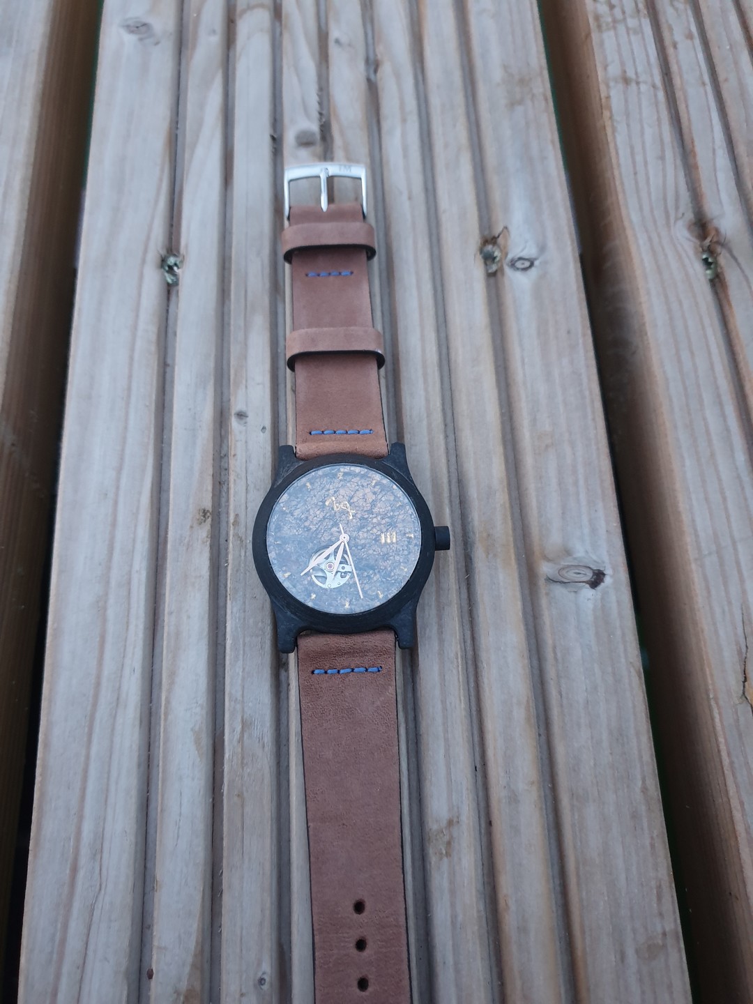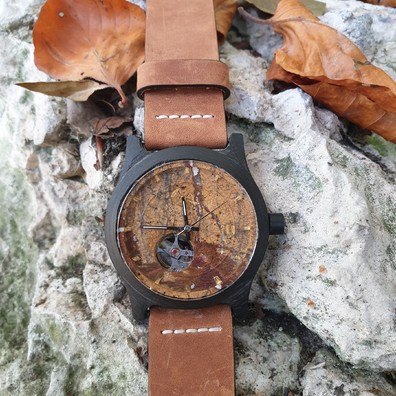 Marmurowa tarcza opakowana w klasyczną kopertę w ciemnym wapiennym kamieniu przykryte szafirowym szkłem. Całość w lekko sportowym charakterze do nadającym się zarówno do codziennego ubrania jak i bardziej eleganckiego.